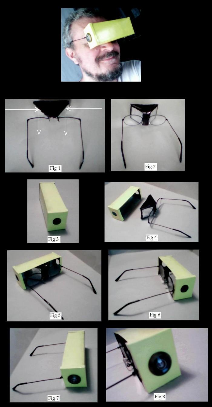 Мы знаем, что у птиц и рыб глаза по обе стороны от головы. Эти очки позволяют человеку почувствовать зрение птицы или рыбы. Это может быть очень интересным развлечением. Представьте, что люди должны передвигаться в специальной комнате, наполненной мягкими предметами, чтобы навредить себе, если они упадут. Люди должны найти свой путь из этого лабиринта, и первым, кто сделает это, будет победитель. Или, возможно, они играют в баскетбол (или другой вид спорта). На картинке ( Рис. 1) Вы видите вид сверху очков, соединенных с зеркалами. Каждое зеркало позволяет человеку видеть то, что находится слева и справа от него. На рисунке (Рис. 2) вы видите изометрический вид очков / зеркал. На рисунке (рис. 3) вы видите прямоугольную коробку с отверстиями с обеих сторон, которые могут иметь рыбоподобные линзы (или, может быть, ничего). На рисунке (рис. 4) вы можете увидеть прямоугольную коробку и очки с зеркалами до того, как они были собраны вместе. На рисунках (рис. 5 и рис. 6) вы можете увидеть другой вид Собранный продукт. На рисунках (Рис. 7 и Рис. 8) вы видите очки с широкоугольными линзами («рыбий глаз»). Это только пример того, как можно изготовить эти очки. Основная идея заключается в том, что они имеют по крайней мере, одно зеркало, которое позволяет пользователю видеть, что может произойти на левой стороне головы или на правой стороне головы.