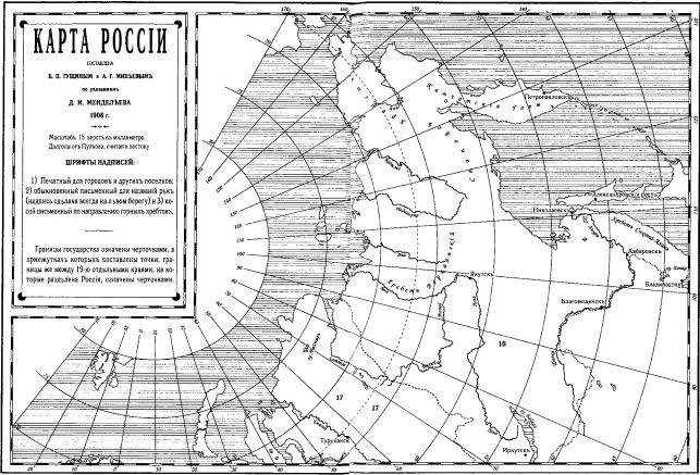 Когда географическая сетка, отличающаяся геометрической простотою, была вычерчена для нанесения карты, прежде всего были приложены немалые усилия для того, чтобы получить правильные очертания всех границ России и рек, в ней протекающих. При этом пришлось пользоваться не только лучшими картами Генерального штаба и Гидрографического отдела Морского министерства, но и некоторыми новейшими сведениями, полученными от указанных ведомств. Таким образом, составлена возможно правильная карта, на которой затем было нанесено разделение всей России на 19 краев или земель, упоминаемых во всем предшествующем изложении. Хотя размеры карты сравнительно не велики и не допускают изображения многих подробностей, тем не менее, благодаря тому усидчивому труду, с которым Б. П. Гущин и А. Г. Михеев заботились обо всех мельчайших частях карты, надеюсь, что в ней нет никаких существенных неточностей, какие, должно заметить, нередко встречаются во многих из карт России, которые пришлось сличать и проверять во время работы.