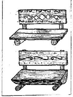 Спинки (и сиденье первой скамейки) декорируют (отделывают) резьбой по дереву или рисунками, выжигаемыми с помощью раскаленных шаблонов.