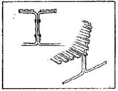 Буковые (дубовые) вставки имеют сечение 20x50 мм и длину 500 – 600 мм. Рейки с помощью клея «Момент», 88Н, 88НП, «Стилит» оклеивают с трех сторон плотным поролоном толщиной 25 – 30 мм. Нижнюю крайнюю рейку, к которой крепят два крючка из стальной полосы сечением 2x20 мм, делают несколько шире – 60 – 70 мм. Верхняя крайняя рейка (подголовник) имеет ширину 80 – 90 мм и толщину 60 мм. К ней тоже крепят два крючка.