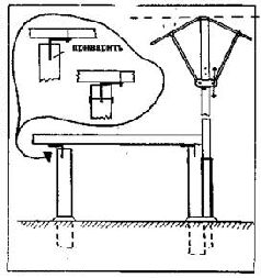 Стационарную мебель типа скамеек делают основательной: из стальных труб на бетонном основании (рис. 34). Обрешетку скамейки привинчивают на оцинкованных (кадмированных) шурупах к стальным уголкам.