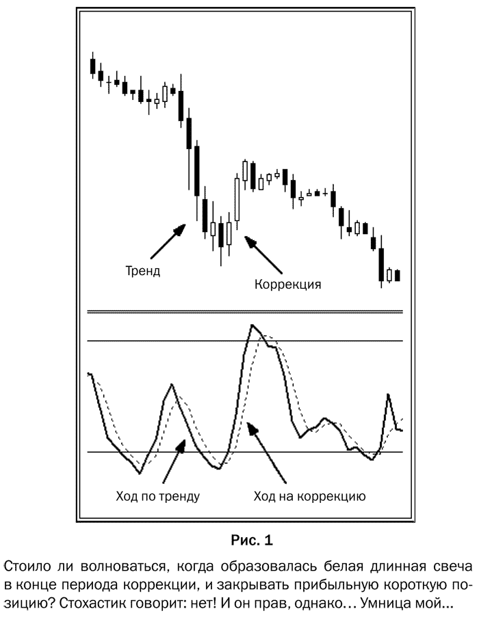 Я называю это (вы можете найти другое определение) «обратной дивергенцией». То есть в литературе рекомендуется на даун-тренде отслеживать расхождение («дивергенцию» по-нашему, по-простому, по-русски) низов, я же отслеживаю (столь же внимательно!) еще и расхождение верхов. Стохастик при коррекции как бы запасается необходимым простором для дальнейшего длительного движения по тренду. И в этом качестве стохастику при работе в тренде цены нет!