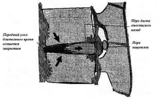 Рис. 32. Схема, показывающая, что в результате длительного закрытия переднего угла межпозвонкового пространства нерв оказывается прижатым к костной стенке межпозвонкового отверстия