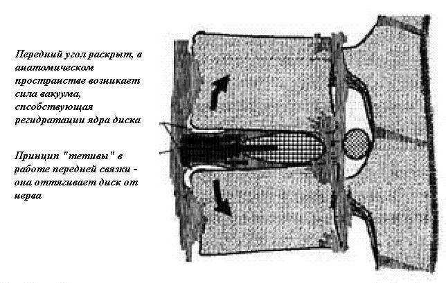 Цель этой схемы — проиллюстрировать тянущее усилие связки, соединенной с передним краем диска, а также процесс появления свободного пространства между телами позвонков и диском, который генерирует силу вакуума. Этот вакуум помогает диску вернуться в исходное положение и, кроме того, всасывает в пространство воду, способствуя более быстрому насыщению ядра водой, чем под воздействием осмотических сил. Существует гипотетическая возможность того, что этот вакуум способен инициировать возвращение содержимого студенистого ядра в первоначальное положение, даже если часть его уже вытекла через разрыв. Облегчение боли свидетельствует о том, что возможность обратного втягивания студенистой массы вполне реальна.