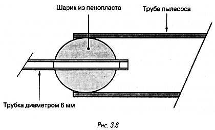 Разумнее использовать трубку меньшего сечения, подобную тем, что применяются для аэрации аквариумов. Трубка вставляется в отверстие, просверленное в шарике из пенопласта. Этот шарик вставляется в трубу пылесоса (рис. 3.8). Получившееся приспособление позволяет удалять стружку и мелкий мусор со дна корпуса после сверления и прокладки кабелей.