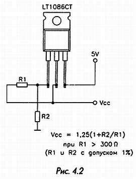 Прежде чем решиться на приобретение бывшей в использовании материнской платы с рабочим напряжением на 5 В, следует уточнить, есть ли на ней свободное место рядом с микропроцессором. Речь идет о серии контактных площадок, предназначенных для размещения микросхемы стабилизатора в корпусе типа Т0220 (в горизонтальном положении), а также нескольких резисторов. Иногда удается найти место и для колодки двухрядных разъемов, в которые можно вставить одну или несколько перемычек для выбора нужного напряжения питания. Модель LT1086CT, приведенная на рис. 4.2, принадлежит к категории стабилизаторов, способных обеспечить требуемое выходное напряжение при входном напряжении 5 В.