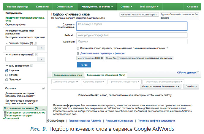 Следующим нашим шагом будет работа с ключевыми словами (keyword tools) в сервисе Google AdWords. Можете просто набрать в поиске Google «keyword tools», и получите ссылку на этот сервис (рис. 9).