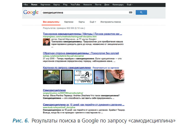 А теперь возьмем слово «самодисциплина». Мы видим наиболее популярные запросы и результаты поиска с этим словом (например, «Самодисциплина за 10 дней»). Судя по всему, книга «Самодисциплина за 10 дней» пользуется бешеной популярностью, поэтому для раскрутки эта фраза нам вряд ли подойдет из-за высокой конкуренции. Вы можете выписать словосочетания, выданные в качестве наиболее популярных поисковых запросов, и протестировать их. Если конкуренция на видеоконтент с такими фразами низкая, можно попробовать раскрутить свой ролик под таким названием (рис. 6).