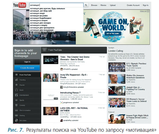 А мы идем дальше. Заходим на сайт YouTube и вводим те же запросы здесь. Начнем со слова «мотивация» (рис. 7). Как видим, здесь популярны совершенно другие запросы с этим словом (например, «мотивация на успех»). Будем считать, что эта фраза нам подходит – выписываем ее в блокнот.