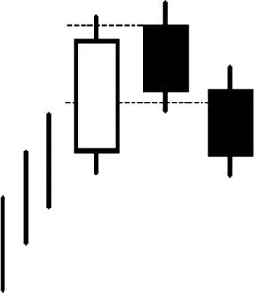 Первая свеча в модели длинная (её тело не менее 50 пунктов для дневного графика EURUSD) белая, вторая длинная чёрная. Обязательно восходящее движение цены перед моделью. У 1-й свечи тени короче тела. Цена open 2-й (чёрной) свечи должна быть выше цены close 1-й (белой) свечи. Цена close 2-й (чёрной) свечи должна быть ниже середины тела 1-й (белой) свечи. Подтверждение ещё одной чёрной свечой требуется только лишь в случае, если 2-я свеча модели закрывается не ниже середины тела 1-й свечи.
