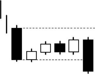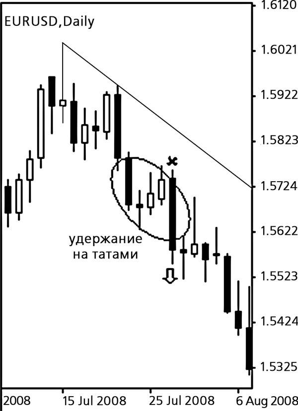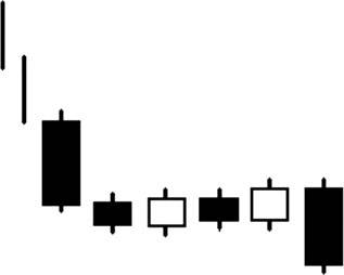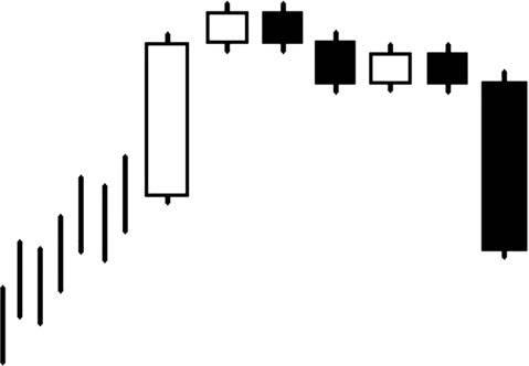 После обязательного нисходящего движения цены формируется длинная (относительно последующих свечей) чёрная свеча с телом не менее 25 пунктов для пары EURUSD, Daily. За ней появляются несколько свечей с небольшими телами (количеством от 3 до 12). Среди них должно быть как минимум две белые свечи. Вслед за ними вновь образуется длинная (относительно предыдущих свечей) чёрная свеча с телом не менее 25 пунктов для пары EURUSD, Daily. Она должна закрыться ниже всех предыдущих свечей.