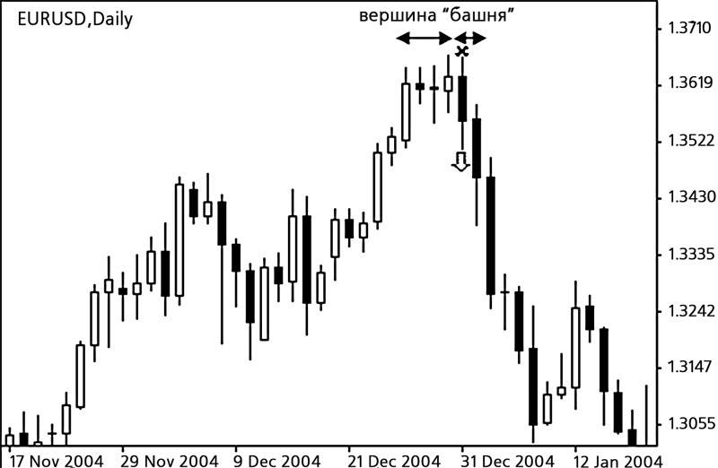 Торговая тактика. Вершина «башня» (падение цены внутри модели происходит быстрее, чем рост) – сигнал к продаже. Если есть открытая (-ые) покупка (-и), её (их) следует закрыть. По этой модели можно открыть сделку (продажу) даже против восходящего тренда. Стоп-лосс устанавливается выше максимума модели на 20 пунктов.