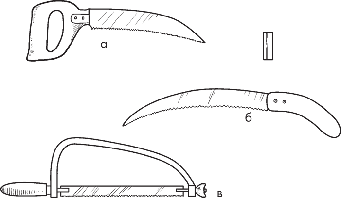 Рис. 27. Садовые пилы: а – серповидная; б – серповидная пистолетного типа; в – лучковая с поворотным полотном