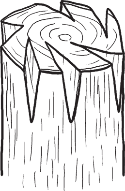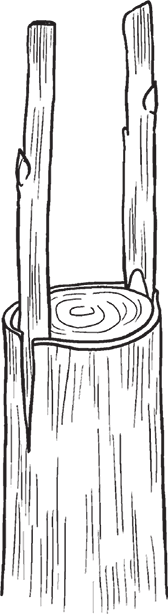 У обыкновенной прививки за кору есть еще одна модификация, при которой продольный разрез на коре подвоя вообще не делается. Чтобы вставить черенки с подготовленными срезами, применяется специальный инструмент – короотделитель. Прививка за кору без продольного разреза (рис. 67) практикуется в случаях, когда кора подвоя толстая, а привой имеет небольшой диаметр (кстати, их также может быть несколько).