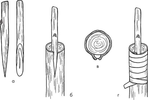 Рис. 68. Улучшенная прививка за кору: а – подготовленный черенок; б – продольный разрез на торце; в – поперечный срез подвоя; г – прилаженная прививка; д – законченная прививка