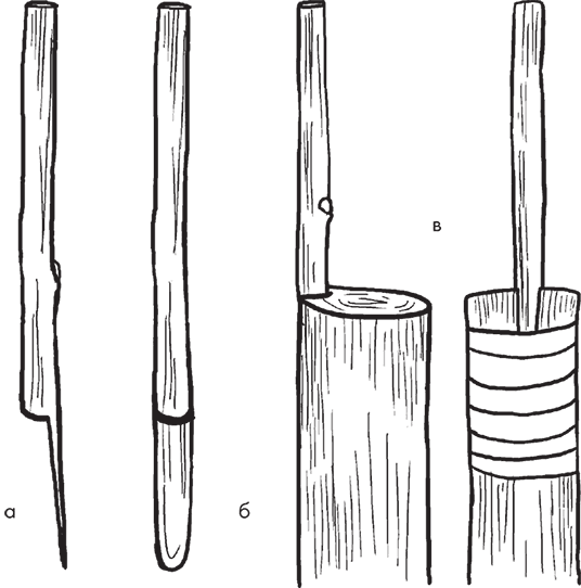 Рис. 64. Простая прививка за кору: а – черенок (вид сбоку и спереди); б – прилаженная прививка; в – поперечный разрез подвоя с привитым черенком; г – законченная прививка
