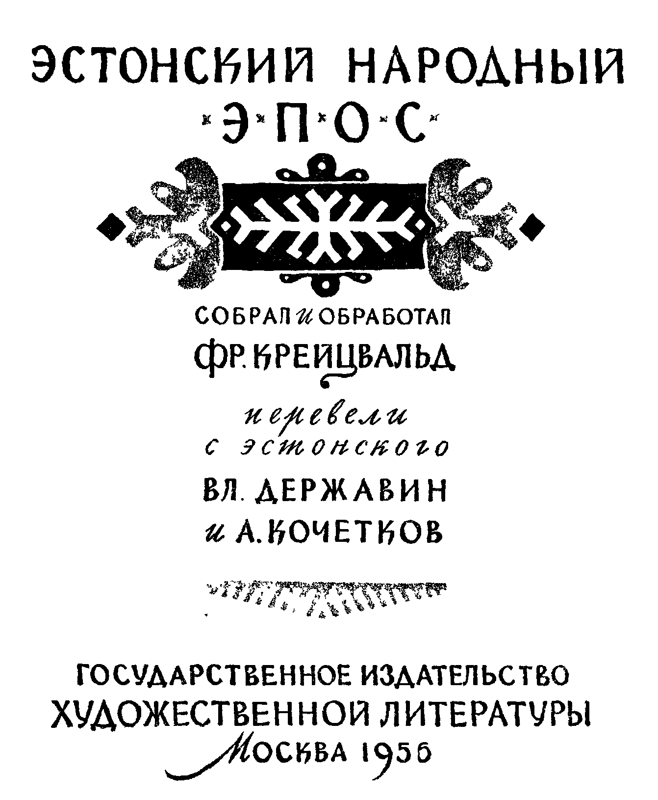 Калевипоэг: Эстонский народный эпос / Собр. и обраб.: Фр. Крейцвальд; Пер. с эстонск.: Вл. Державин и А. Кочетков. — Москва: Гослитиздат, 1956. — 497 с., фронт.