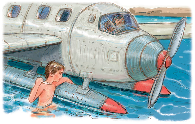 Самолёт затонул, его больше не видно. Но на воде показались люди. Ребята, волнуясь, посчитали. Всё в порядке – их трое.