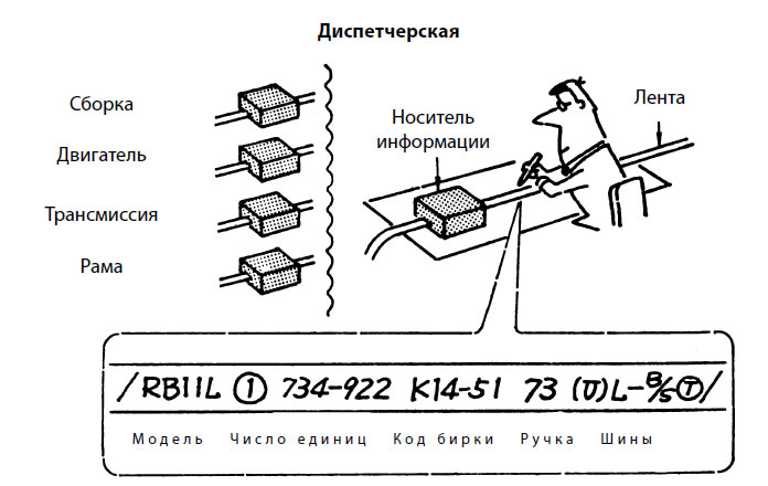 Носитель информации – это разновидность электрического средства связи. В диспетчерской оператор следит за соблюдением разработанной компьютером дневной схемы последовательности сборки. Он от руки наносит на ленту данные о модели каждой машины, шинах, трансмиссии и т. д., и эта информация поступает на сборку и на участки, на которых устанавливаются рамы, двигатели и трансмиссии. Благодаря этой приводимой в движение электричеством ленте все эти участки узнают, что им делать дальше.
