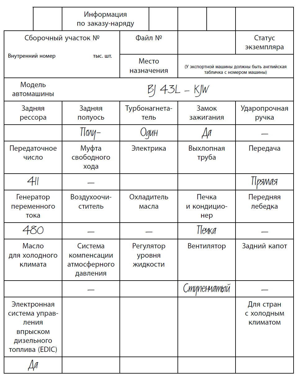 На рис. 16 представлен образец бирки, содержащей подробные данные о машинах, которые требуется собрать. На корпус машины сборочной линии наклеивается заранее подготовленная бирка, код которой указан на ленте, и рабочие на сборке руководствуются указанными на этой бирке спецификациями.