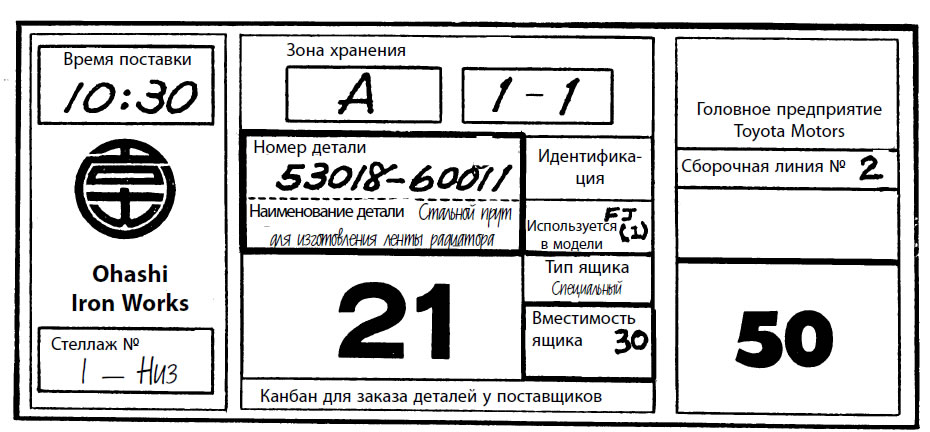 Когда Ohashi Iron Works поставляет детали головному заводу Toyota Motors, используют этот канбан заказа деталей у поставщиков. 50 – это номер проходной завода Toyota, через которую будут приняты детали. Пруток поступит в зону хранения А. 21 – это номер детали на тыльной стороне.