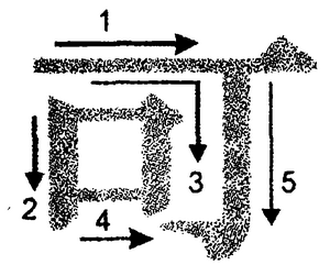 Единственное, с чем нам всерьёз придётся разобраться, так это с дважды повторяющимся элементом левой части иероглифа (песня). Как подсказывает весь наш предыдущий опыт, в данном знаке должно быть всего четыре черты, однако на схеме их пять. По какой то причине огибающая угловая линия разбита на два отдельных отрезка (1 и 5), в то время как линия 3 ведёт себя так, как и должна вести себя в подобной ситуации. Причина заключается опять же в результирующем направлении движения руки: если бы линию 1 и 5 мы провели без отрыва как единое целое, то нам, нарисовав её, пришлось бы вновь подняться