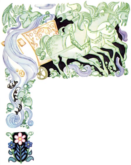 Запрягла она трех черных мышей в карету из ореховых скорлупок, одну мышь посадила за кучера, сама села в карету: