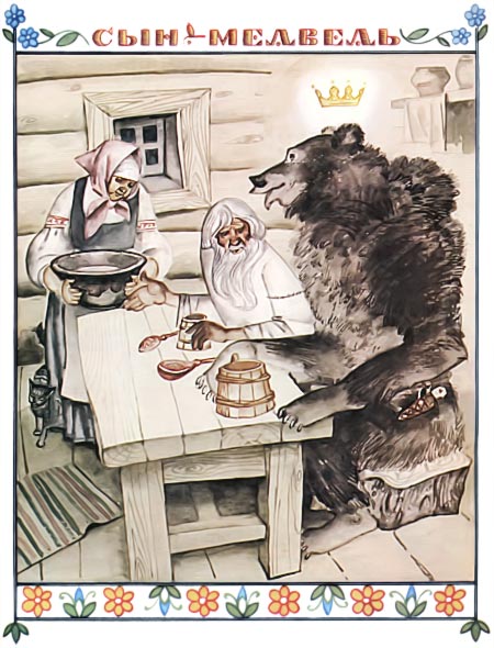 Медведь подает старухе лапу: «Здравствуй, мать!» Старушка так испугалась, что без чувств упала. Медведь лапой слегка ударил ее по плечу — она и очнулась. Медведь говорит: