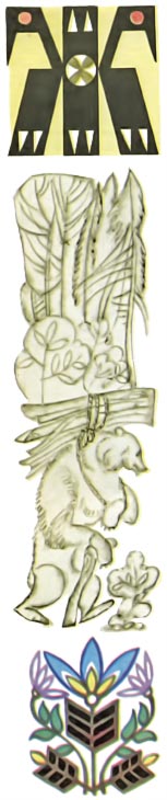 Старик подумал-подумал: «Странный какой медведь, по-нашему говорит, пожалуй, надо взять». Привел медведя домой. Жена у окошка лен прядет. Муж говорит: