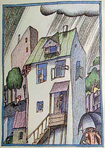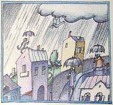 Только один маленький прохожий совершенно не любил бегать под дождём. Смотрите, как неумело прыгает он через лужи. Очень смешной прохожий, верней, пробегающий, а точнее, пропрыгивающий.