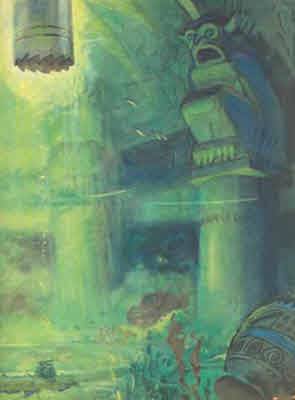 Но знакомого нам краба не было на полках. Он развлекался согласно своему положению на дарвиновской лестнице существ и охотился, бегая по мраморному полу, но стараясь держаться подальше от призрачно светящегося столба воды, который шел из окна в куполе. Многие предметы, некогда покоившиеся на полках, теперь валялись на полу, и, чтобы подкараулить неосторожную рыбешку, краб бестрепетно влезал в глазницы золотых статуй, обросших зеленой бородой.