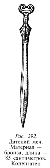 Бронзовые мечи древних британцев принадлежат к двум типам: с листообразным и с рапирообразным клинком; и тот и другой были хорошо отлиты. Полная длина последнего — около двух футов, самый маленький — шестнадцать дюймов, самый большой — тридцать, редко больше. Клинки эти чаще всего закругленные, но ближайшая к режущему лезвию часть слегка опущена, чтобы образовывать пустую канавку. Ширина клинка наибольшая в первой, от рукояти, трети, что облегчало извлекание меча из ножен. Почти во всех случаях меч усилен закругленным ребром жесткости, более или менее рельефным; либо имеются продольные гребни, как рихтованные, так и нерихтованные, или параллельные линии, тянущиеся либо по всему клинку, либо по большей его части. Некоторые совмещают ребро жесткости с продольными гребнями. Плечи меча либо ровные, либо имеют выемку или загнутую кромку. В редких случаях внешняя часть эфеса сделана из бронзы: доктор Эванс приводит изображение такого экземпляра. Общая длина оружия — двадцать один дюйм, из которых пять занимают круглая головка и рукоять, рассчитанная на большую ладонь. Ручка кажется отлитой прямо на клинок — похоже, что она сделана из такой же бронзы, и заклепок, которыми могли бы скрепляться эти две металлические составляющие, нет. Серповидная часть ее, середина выемки которой приходится на начало ребра жесткости (рис. 293), — характерная черта, которая на протяжении нескольких веков была свойством бронзового оружия северного производства.
