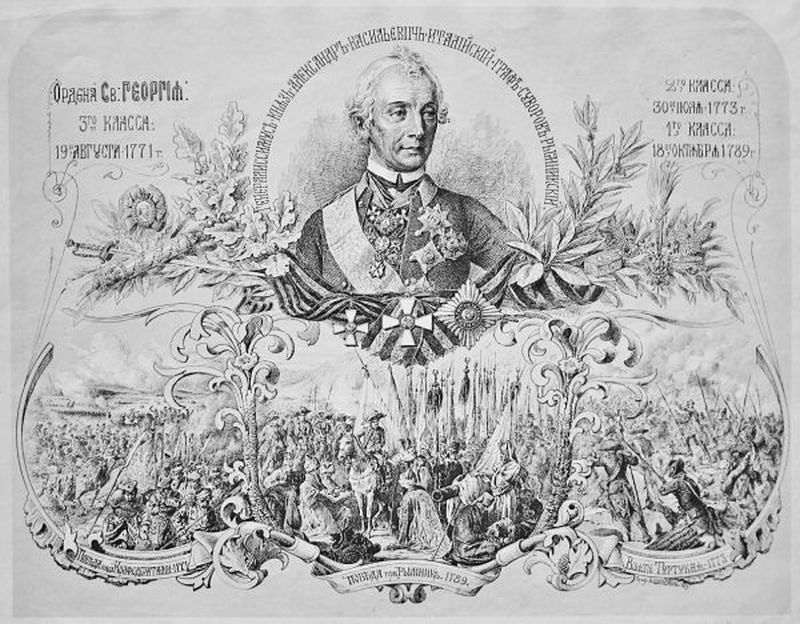 Гравюра с портретом А.В. Суворова, на которой в центре символически изображена победа при Рымнике. А. Шарлемань, 1870