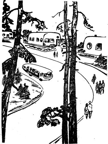 Утро начиналось так: перед стройкомбайном разломали забор из бетонных плит. Тесно машине стало на участке. Впереди расстилалась степь, и лишь вдали лиловел лес. К нему протянулась белая полоса, еще вчера нанесенная геодезистами. Тут пройдет будущая улица необычного поселка.