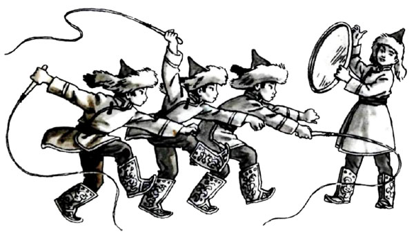 Но птенец не захотел сидеть, а беспокойно толкнулся снова и где-то в глубине у самого горла сам отмахал беззвучно ещё одну мелодию. Он собирался начать третью, но тут ударил, легко зазвенел бубен, и по сцене в солнечных халатах, в новеньких сапожках-гутулах, пригнувшись, будто на лошадках, помчались монгольские ребята. Они ловко вращали нагайками, с удалью щёлкали по голенищам, а хор затягивал песню о просторах Монголии — и все в зале улыбались и раскачивались в её ритме. Потом в национальной борьбе закружились маленькие крепкие борцы.
