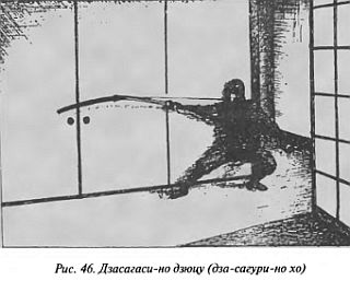 Если противник выполняет укол справа от сагэо, нужно сделать шаг по диагонали вперед-влево, отклонить копье влево, зажать его древко под правую мышку и оплести шнуром, сковав движения. При попытке противника выдернуть оружие моментально с ним сблизиться и заколоть.