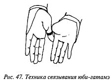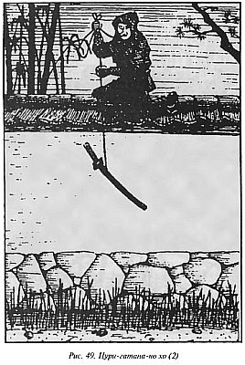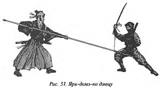 7. Яри-домэ-но дзюцу — «способ остановки копья», или нагацука-дори — «захват длинного древка» — так называется техника оплетания длинного древкового оружия противника вроде копья или алебарды с помощью шнура, чтобы сковать его действия и, воспользовавшись временной беспомощностью, заколоть мечом (рис. 51).