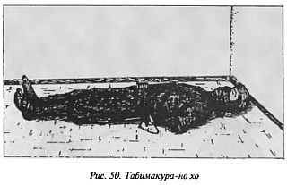 6. Еще один вариант употребления сагэо для устройства «места ночлега» назывался табимакура-но хо — «способ походной подушки». В этом случае использовалась пара мечей — длинный и короткий. Связав шнуры обоих мечей друг с другом, ниндзя туго натягивал их под телом. Мечи помещались вдоль тела, и ниндзя ложился спиной поверх связанных сагэо. Большой меч (дайто) находился слева от шпиона, а малый (сёто) — справа. Спал шпион, обхватив дайто левым предплечьем (рис. 50).