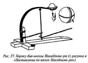 Хороку-бия делали из глины, не покрытой глазурью, о чем свидетельствует другой вариант записи ее названия — «глиняные миски». Ниндзя соединяли вместе две миски. Получался глиняный шар, внутрь которого закладывали пороховой заряд, кусочки свинца, разные железки и т. д. Сквозь маленькое отверстие к заряду подводился фитиль, начиненный порохом, которым глиняный шар обматывался крестообразно (рис. 37).