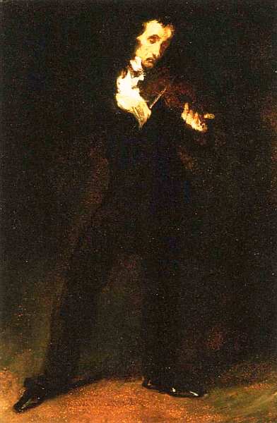 Фердинанд-Виктор-Эжен Делакруа — выдающийся художник-романтик. На концерте Паганини в Парижской опере мастер побывал 9 марта 1831. Как само выступление, так и внешний вид маэстро поражали и восхищали одновременно, не оставляя спокойным и равнодушным ни одного зрителя. Худой и бледный, с плохими зубами, длинными спутанными волосами, спадающими на плечи, Паганини производил
