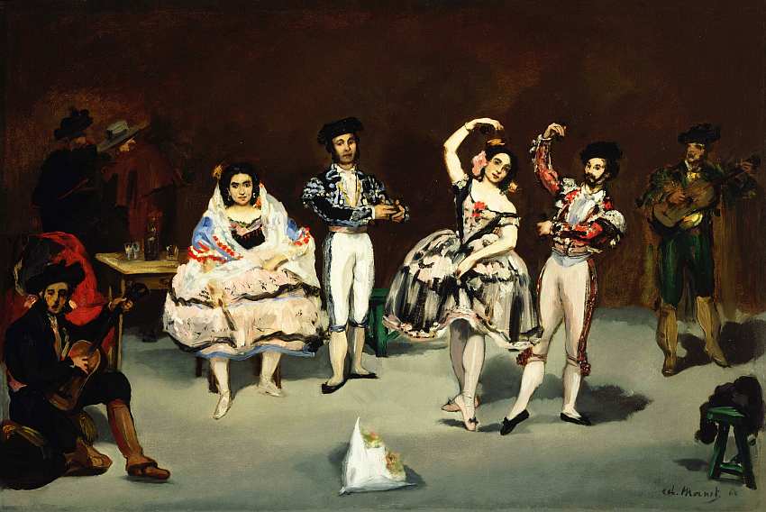 Обращение Мане в своем творчестве к испанскому балету неслучайно и объяснимо, ведь искусство Терпсихоры всегда представляло собой одну из самых ярких характеристик Испании, являлось своеобразным воплощенным темпераментом и душой страны. На холсте изображены две пары во время репетиции. Сцена и сами танцующие выписаны в светлых тонах, что позволяет акцентировать характерные позы, соответствующие костюмы. Им аккомпанируют два гитариста, фигуры которых контрастно темны и находятся на втором плане.