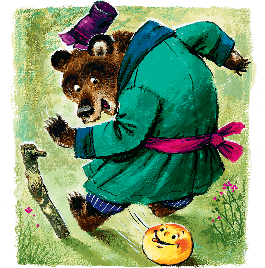 Я от дедушки ушёл,Я от бабушки ушёл,Я от зайца ушёл,От тебя, волка,Не хитро уйти.Катится колобок по лесу, а навстречу ему медведь идёт, хворост ломает, кусты к земле гнёт:
