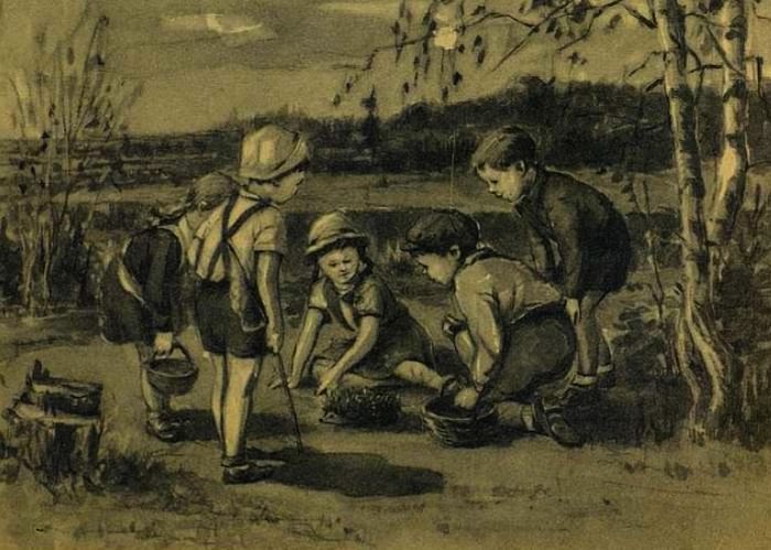 Сидит Коля Зайцев возле пенька, собирает в кружечку ягоды.