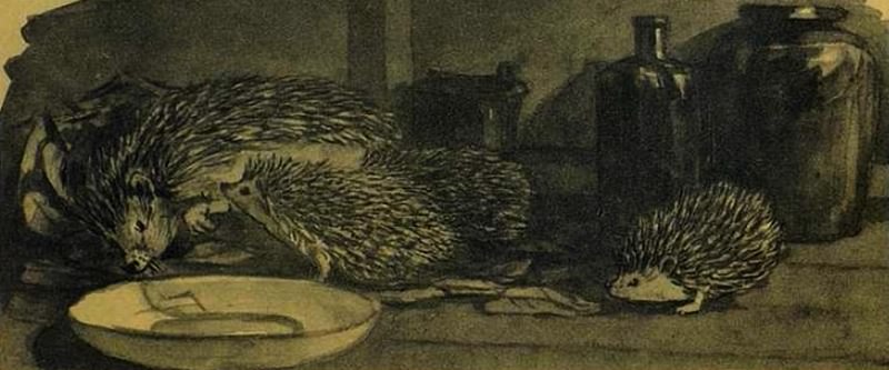 И вдруг самый бойкий из ежат забрался в блюдце и начал топтаться, мешая матери пить.
