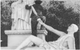 Так Чаплин и сделал. На первый взгляд в эпизодах с фашистским диктатором есть черты, схожие с ранними фильмами Чаплина. Вспомним только, что одним из любимых мотивов Чаплина была борьба с человеком, казавшимся гигантом рядом с хилым, маленьким Чарли. Но Чарли такое сопоставление возвышало, а Хин келя — убивает. У Хинкеля есть приятель другой диктатор, Наполони (Муссолини) чья фигура производит почти устрашающее впечатление. И Хинкель, подавленный огромным ростом, зычным голосом обжорством Наполони, стремится, движимый идиотским и маниакальным честолюбием, во что бы то ни стало сесть выше чем Наполони, сожрать и выпить больше чем он. Но Чарли — Давид в борьбе с Голиафом неизменно привлекал симпатии зрителей, а Хинкель отталкивает маниакальным автоматизмом реакций, убожеством характера, одержимого мелкими и низменными страстишками. То же происходит в сценах, когда Хинкель жонглирует земным шаром, когда стреляет в сердце изобретателя непробиваемой ткани или заставляет выпрыгнуть в окно человека, выдумавшего самораскрывающийся парашют. Комическое работает здесь против персонажа. Образ Хинкеля — образ огромной сатирической, уничтожающей силы.
