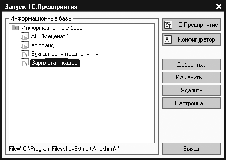 Для запуска программы выберите в главном меню команду Пуск -> Программы -> 1С: Предприятие 8.0, в открывшемся окне запуска программы выберите название информационной базы и щелкните на кнопке 1С: Предприятие (рис. 30.1).