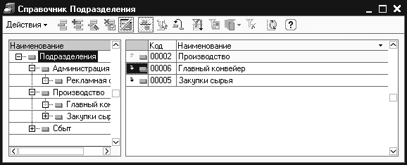 Откройте справочник командой Предприятия -> Подразделения. Левая часть справочника предназначена для просмотра структуры предприятия. Справочник Подразделения может быть иерархическим, то есть в нем можно создать крупные подразделения, которые, в свою очередь, делятся на более мелкие (рис. 32.1). Обычно в состав предприятия входят администрация, торговый отдел, производство, отдел кадров.