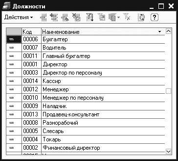 Названия штатных должностей предприятия добавляются в справочник Должности (рис. 32.3). Выберите команду Предприятия -> Должности.