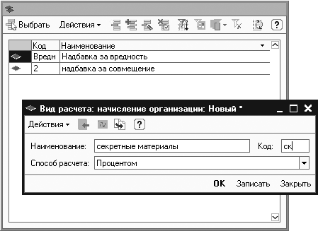 Надбавки, которые применяются на предприятии, вводятся в справочник Надбавки, который открывается командой Штатное расписание -> Надбавки. Записи в справочник добавляются с помощью кнопки Добавить. Введите наименование надбавки и укажите способ расчета: процентом или суммой (рис. 32.4).