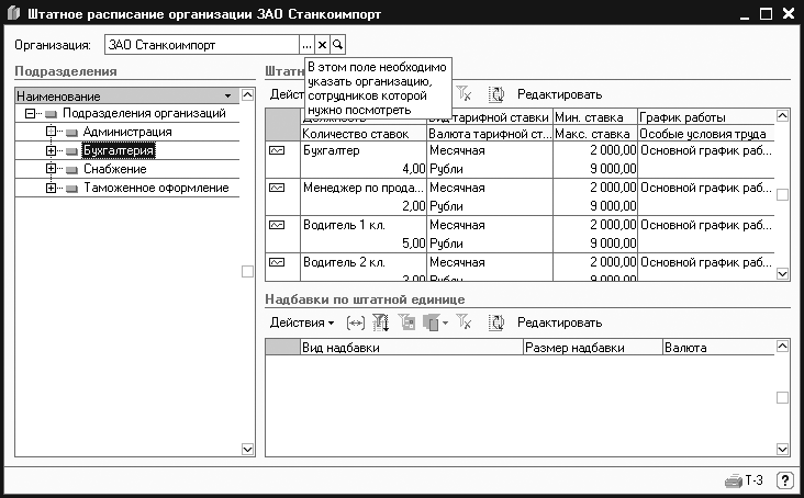 Формирование структуры предприятия в программе начинается с введения названий подразделений и штатных должностей.